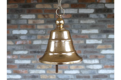 This is a brand new metal bell with a shiny gold finish. The bell has a looped hanging point connected to a spherical fitting, leading down to a tiered bell structure. The bell widens in three stages. A rod runs down the centre of the bell. Ideal for hanging in a garden or porch area.