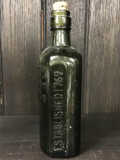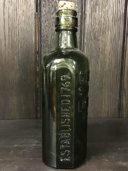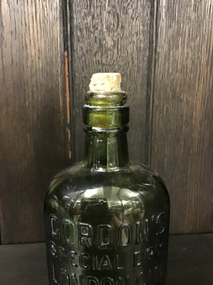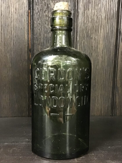 A green glass bottle that reads "Gordon's Special Dry London Gin" and "Established 1769". Complete with associated cork lid.