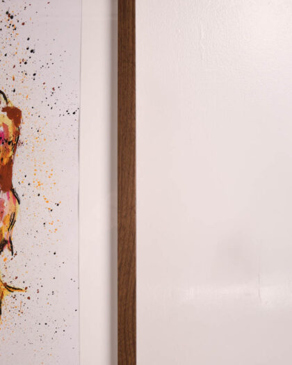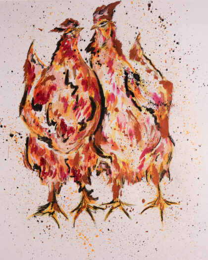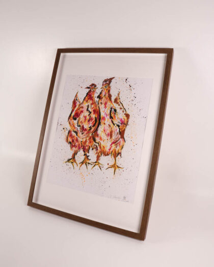 Brand new framed chicken painting by Kate Broderick. Features two expressive chickens in orange and brown tones, framed in a dark brown wood.