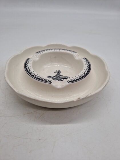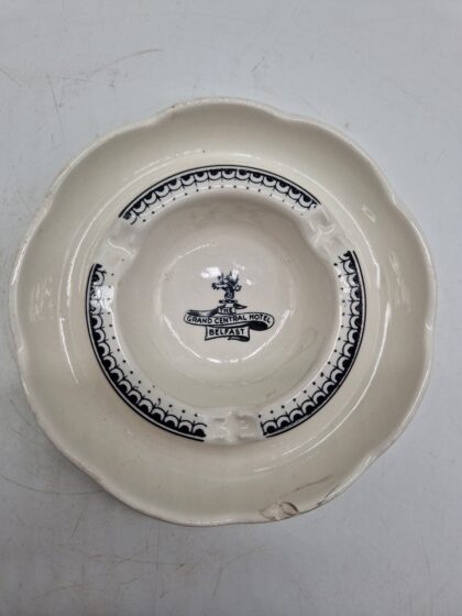 A ceramic ashtray made for the Grand Central Hotel Belfast. Vitreous Ironstone manufactured by Dunn Bennett & Co. Ltd. Burslem England and supplied by Tom Jones Belfast Ltd.