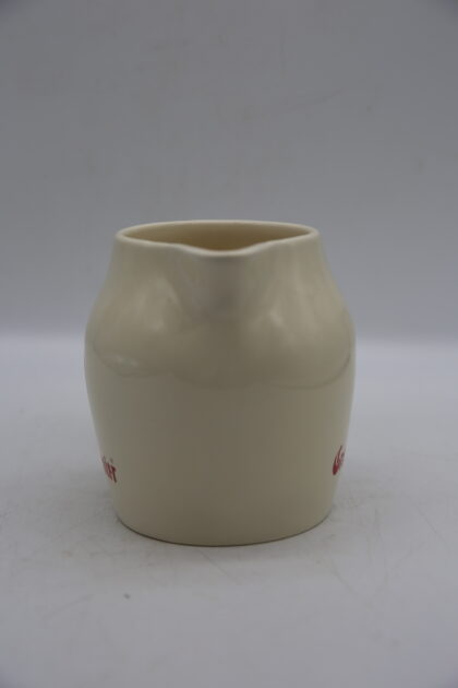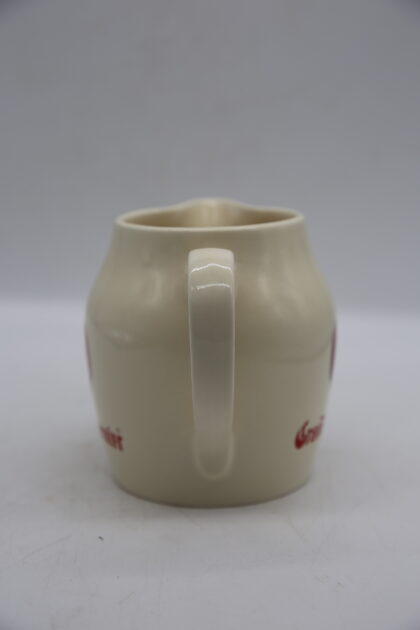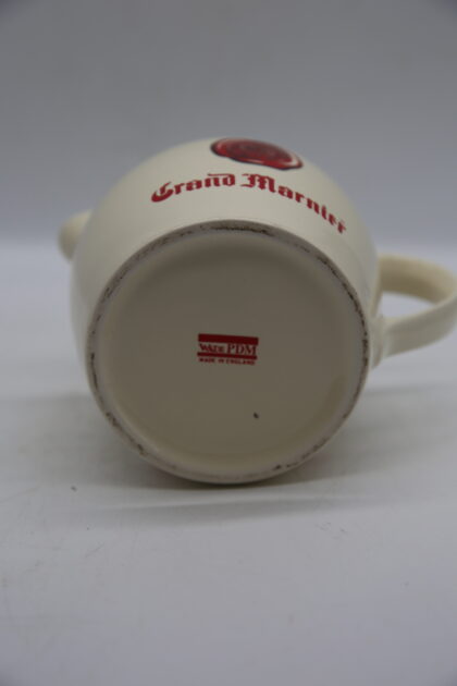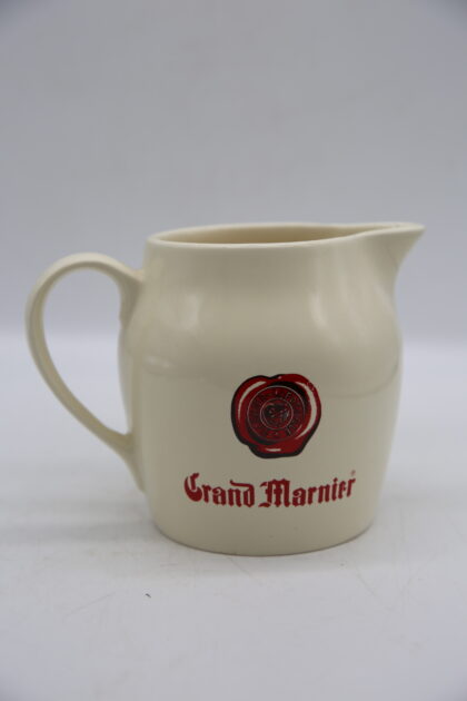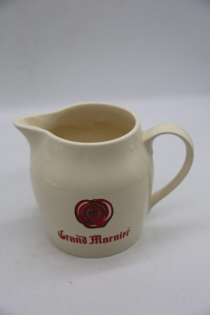A white glazed ceramic bartop water jug. Bears red lettering which reads, "Grand Marnier". Made by Wade and bears red backstamp to base.