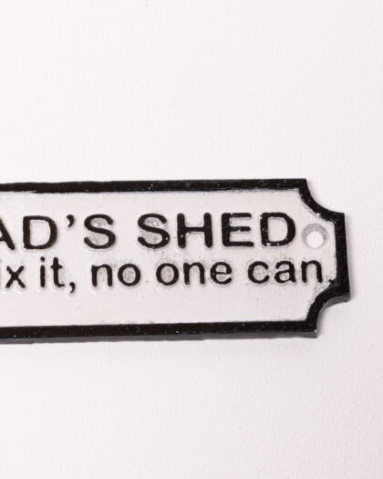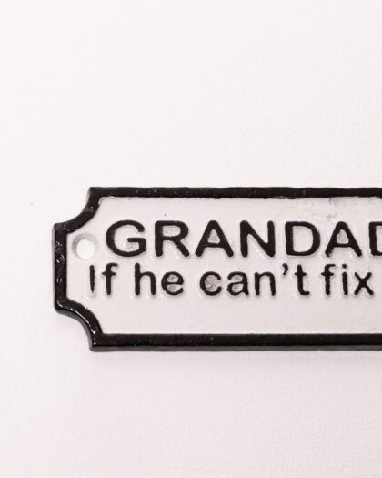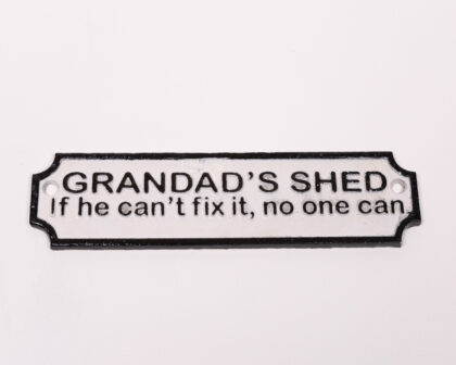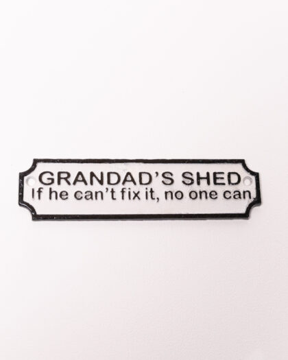 This charming cast iron sign comes with the lovely message "Grandad's Shed - If He Can't Fix It, No One Can". Finished in the classic vintage cast iron style, the sign has a white background, with a black raised border and lettering. Fully handpainted, the sign also has two pre-drilled holes, making it easy for Grandad to hang on a wall of his choosing! Makes a lovely touching gift for a Grandad that enjoys tinkering in his shed!