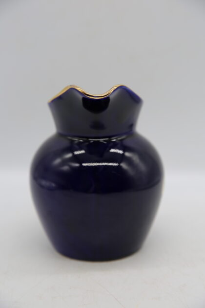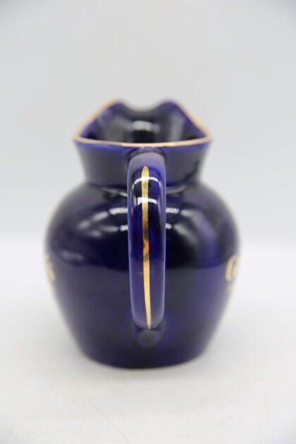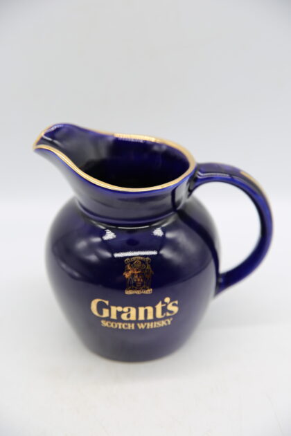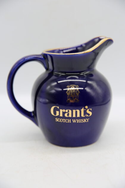 A blue glazed ceramic bartop water jug. Bears gilt decoration and lettering which reads, "Grant's Scotch Whisky". Made by Wade and bears red backstamp to base.