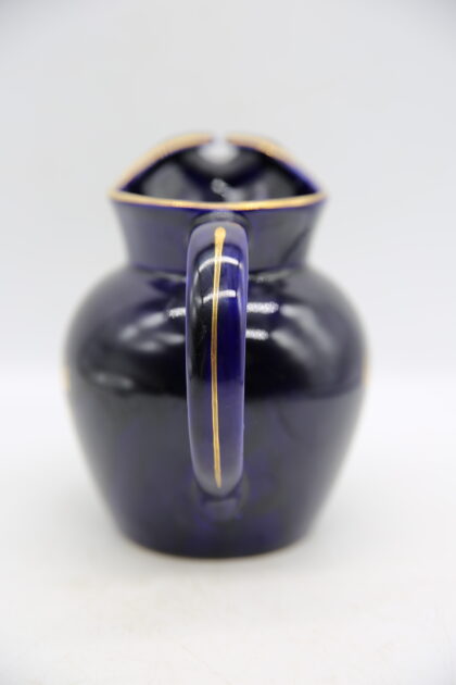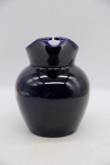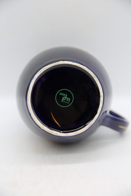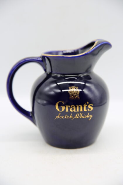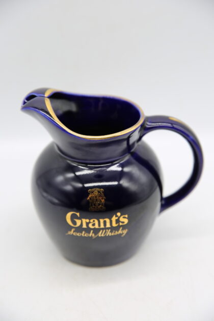 A blue glazed ceramic bartop water jug. Bears gilt decoration and lettering which reads, "Grant's Scotch Whisky". Made by Wade and bears green backstamp to base.