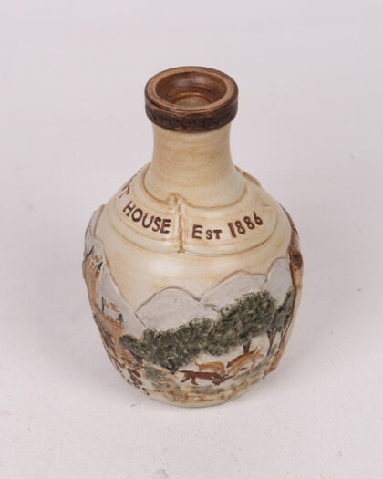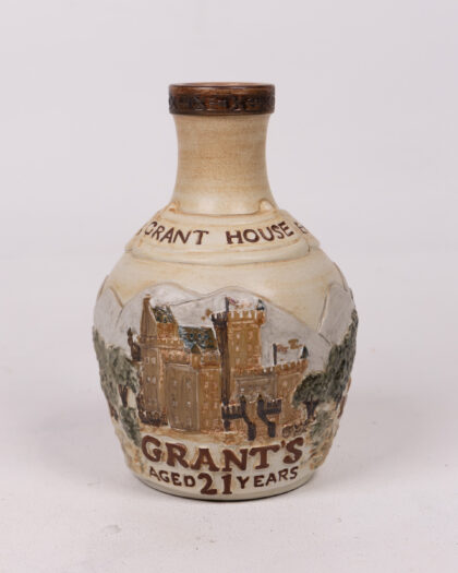 This is a vintage Grant's Aged 21 Years whiskey decanter. It features an embossed and painted scene of Grant House. The decanter has a brown-glazed top and is in excellent condition, showcasing the brand's heritage and making it a great addition to any collection or home bar. A charming piece for whiskey enthusiasts.