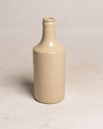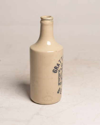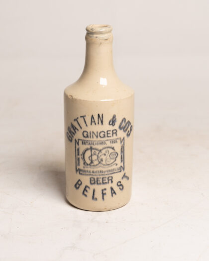 A white, glazed stoneware bottle for Grattan & Co's Ginger Beer Belfast. Bears impressed Govancroft Glasgow maker's mark.