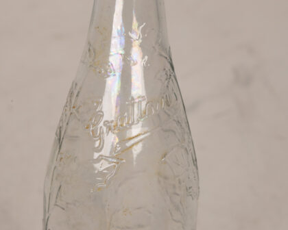 This is a vintage Grattan's clear glass bottle. The bottle features an embossed leaf design around the body and the Gratton's name embossed near the top. The bottle is clear glass and has a slender neck. It appears to be in good condition for its age, though some minor surface wear and potential internal staining or residue should be expected. Perfect for display or collector.