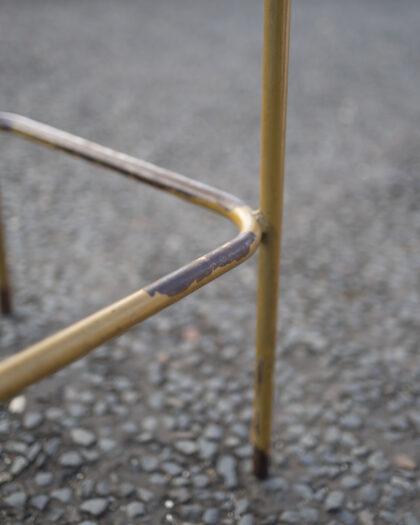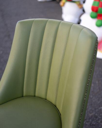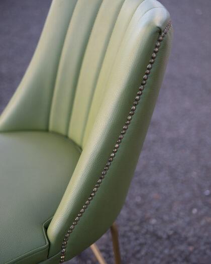 A tall green leatherette bar stool with studded edge and brass effect legs.