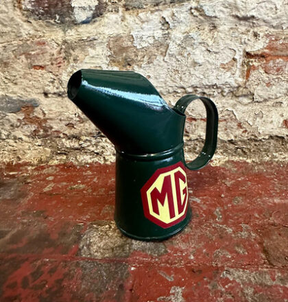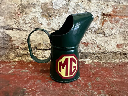 Brand new green metal oil can featuring the classic MG logo in red and yellow. Functional and decorative piece for automotive enthusiasts.