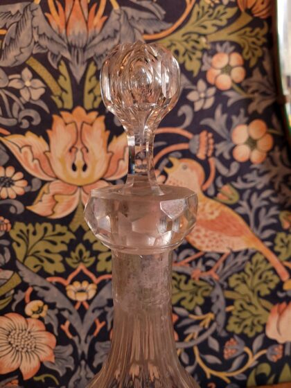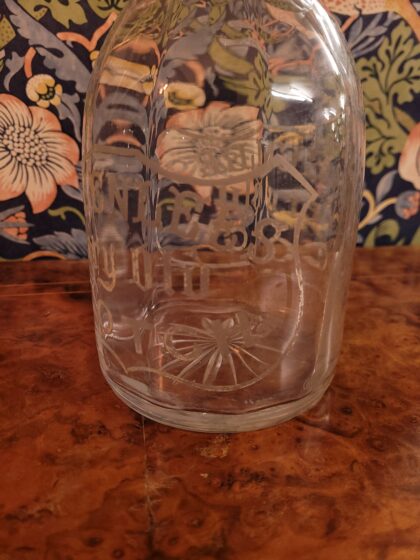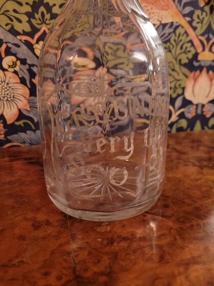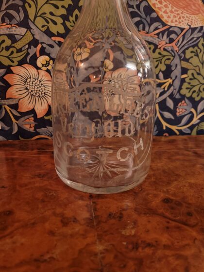 A large glass decanter with stopper bearing etched lettering on both sides which reads, "Greenlees Very Old Scotch".