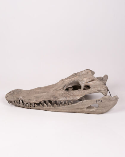 A finely crafted Crocodile Skull Replica, perfect for adding a touch of the wild to your home decor, or for a halloween decorative item. The skull is made from a light grey material. It has a number '2735' inscribed on the jaw line. The skull itself is in good condition, with all the main details visible. However, there are some slight imperfections and wear on the skull, which adds to it's naturalistic look. Would look great in any room of the home as a decorative piece.