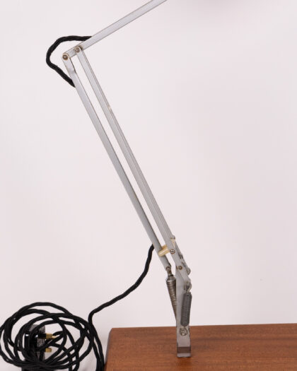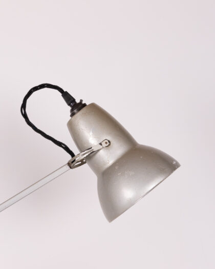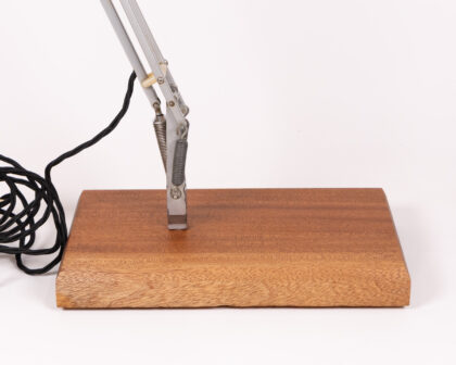This is a vintage articulated desk lamp with a wooden base. The lamp features a grey-painted metal shade and an articulated arm, allowing for adjustable lighting angles. The base is made of wood, providing a sturdy foundation. The lamp has a black cable with a standard UK plug. The paint on the shade shows signs of wear, which add to its vintage charm. Overall, it is in good working condition, offering both functionality and a touch of vintage aesthetics to any workspace. Rewired and PAT tested in the On The Square Workshop.