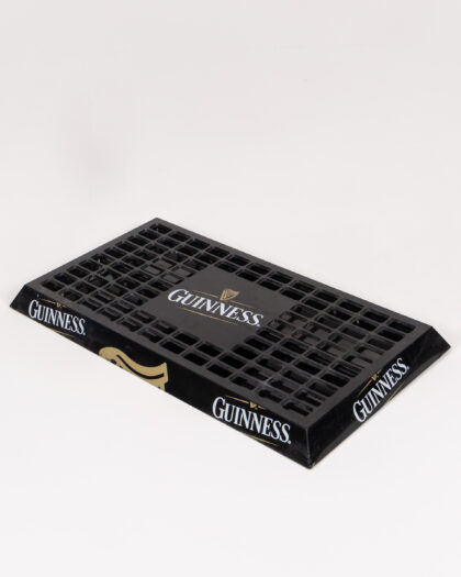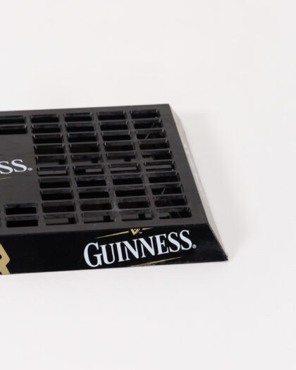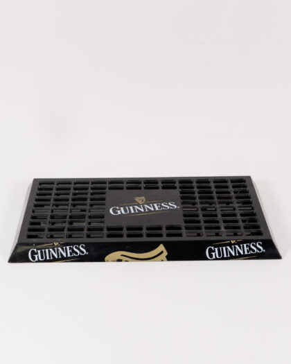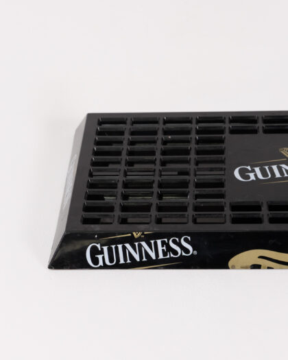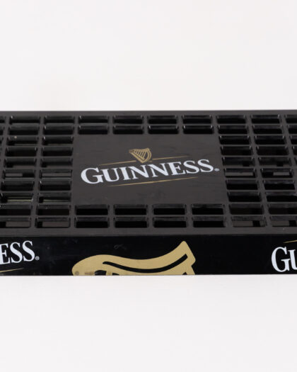A Guinness Drip Tray made from black plastic. The mat has the Guinness logo in white and gold. It's perfect for catching spills behind the bar or for adding a touch of Guinness charm to your home bar. The mat is in good condition and is ready to use. Features the Guinness name and Harp logo. A great addition for collectors or any home bar.