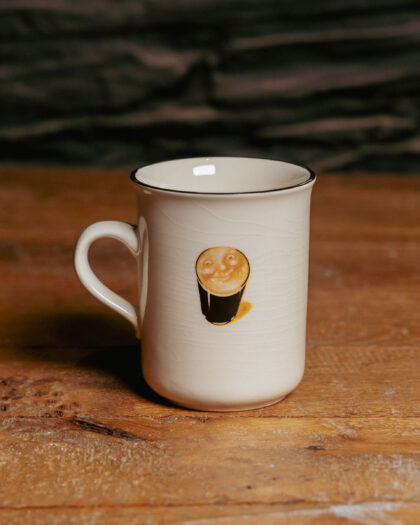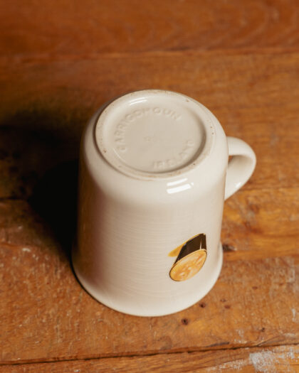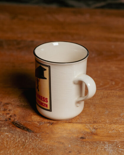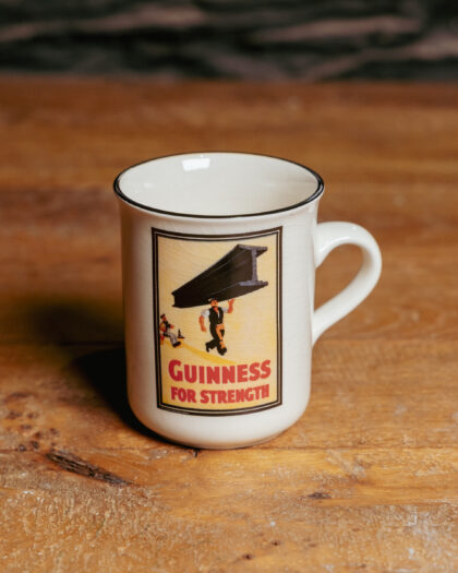 A white glazed ceramic mug with applied Guinness for Strength poster and mascot. Made by Carrigdhoun Ireland.