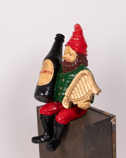 Resin figurine of a leprechaun holding a harp and Guinness. Painted, some paint losses, otherwise in good condition.