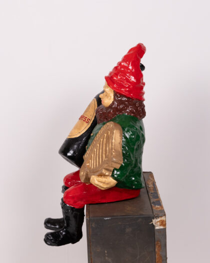 A Guinness resin figurine of a leprechaun holding a harp and bottle of Guinness. The figurine is painted with a red hat and trousers, a green waistcoat and black boots. The bottle is painted black with a beige label. The Harp is gold. There are paint losses and chips to the statue. This item would make a fun gift for a Guinness lover.