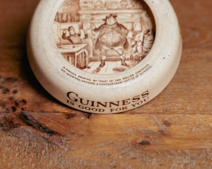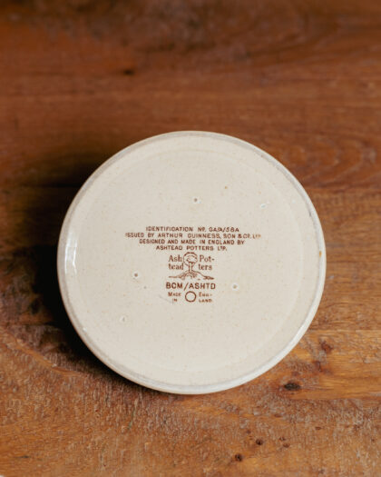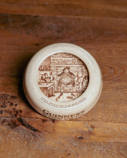A glazed ceramic ashtray with recurring "Guinness is good for you" slogan around the circumference. The inside features, "A famous drawing by 'Phiz' of Sam Weller composing his valentine, showing a contemporary notice of Guinness". Bears brown lettering to base which reads, "Identification No. GA/A/58A Issued by Arthur Guinness, Son & Co. Ltd. Designed and made in England by Ashtead Potters Ltd.".