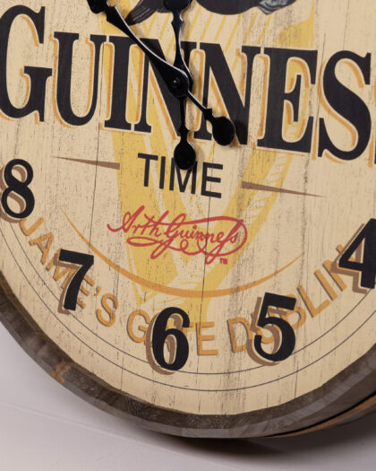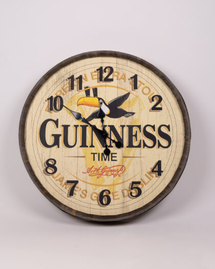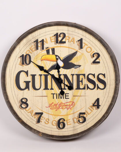 A striking and fun Guinness themed wall clock. Featuring the distinctive branding associated with the famous stout, along with the iconic toucan. Constructed with a wood effect frame and cream coloured clock face, with black numerals and hands. Would make a lovely addition to a home bar, kitchen, or 'man cave'.