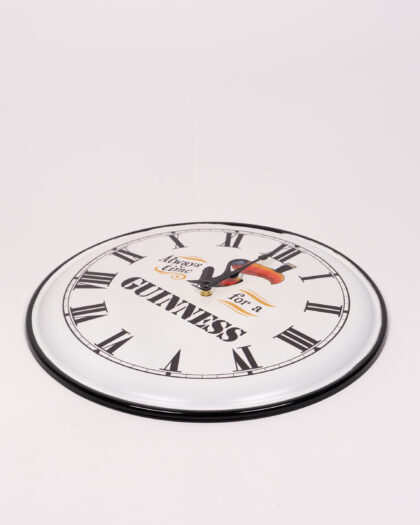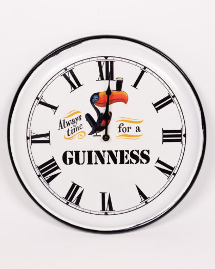 This Guinness wall clock makes a lovely addition to any home, pub or bar. The clock face features the well known Guinness toucan balancing a pint on its beak. The clock is white with black hands and roman numerals as well as the phrase 'Always time for a GUINNESS'. The clock features an orange and black toucan with a glass of Guinness on its beak. This is a fun, quirky and well made novelty clock that is in excellent condition.