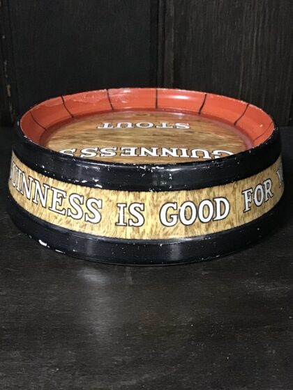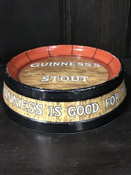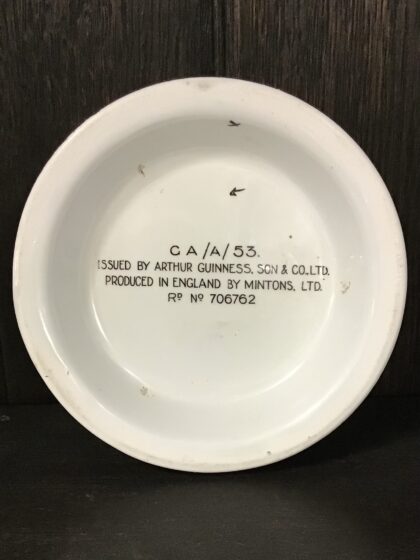A glazed ceramic ashtray in the form of the top of a barrel. Bears white lettering that reads, “Guinness’s Stout” and, “Guinness is Good For You”. Bears black lettering to base which reads, “GA/A/53 Issued by Arthur Guinness, Son & Co., Ltd. Produced in England by Mintons, Ltd. Rd. No. 706762”.