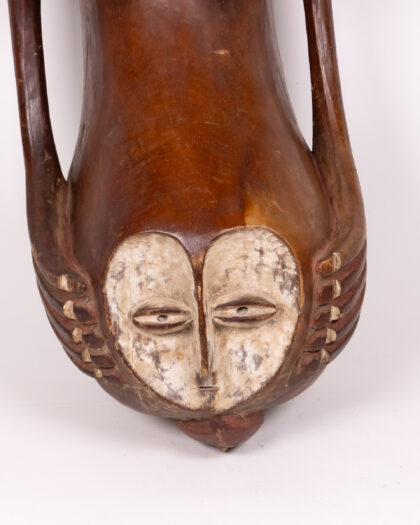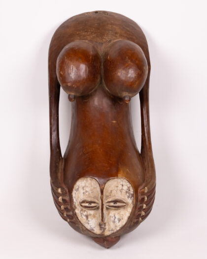 Discover this captivating vintage Makonde body mask, a powerful hand-carved representation of the female form. Originating from Tanzania, this sculpture was traditionally worn by Makonde male dancers during ceremonial rituals to create an effective illusion when taking on the role of a woman. Crafted from rich, deep brown wood, the figure features distinctive white paint accents that highlight the facial details, creating a striking contrast. This unique piece embodies the abstract and sensual style characteristic of Makonde art, making it a profound example of global cultural heritage. In overall good condition with no visible damage, this sculptural art piece is perfect for adding an authentic touch of African tribal art to any discerning collection or interior space.