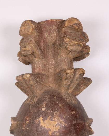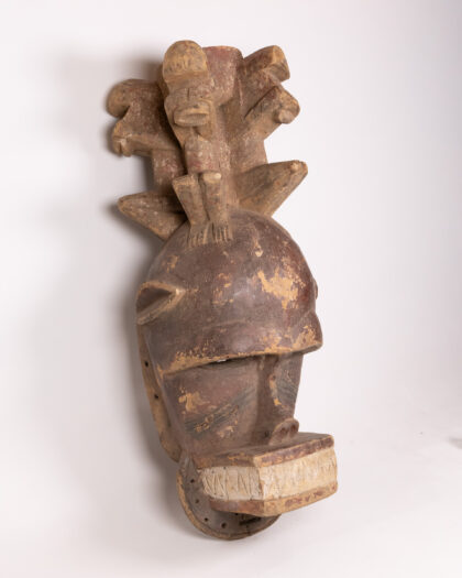 This is a hand-carved wooden mask, featuring a distinctive tribal-inspired design. The mask has been carved with great attention to detail. The mask is predominantly brown, with black detailing around the eyes and mouth. The mask has a round base and a tiered, decorative crown, carved with geometric patterns. The overall condition is fair, with some visible wear and cracking, adding to its rustic charm. This mask would be a unique piece of wall decor, adding character to any room.