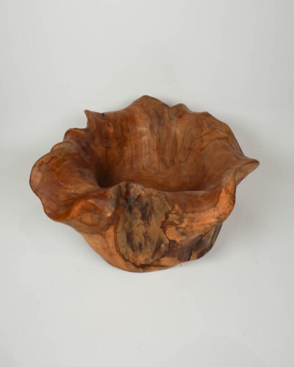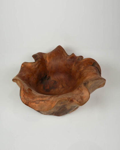 Hand carved wooden bowl with a natural, organic edge. The bowl features a rich, brown tone and a smooth finish. In excellent condition.