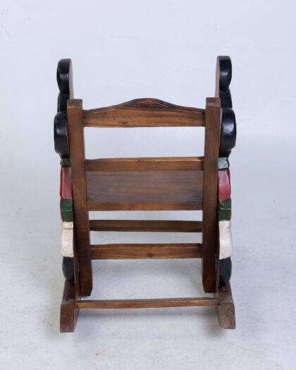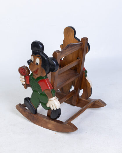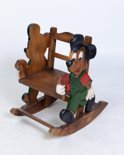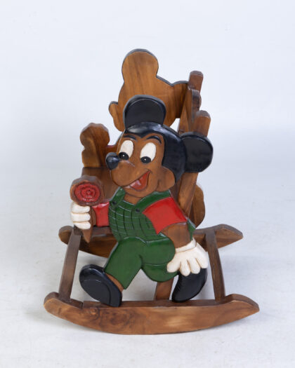 Hand carved wooden rocking chair featuring Mickey Mouse in overalls. A unique and charming decorative piece for a child's room.
