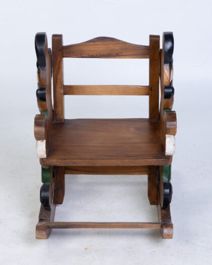 This delightful children's rocking chair has been hand-carved and painted, featuring Mickey Mouse. Mickey is shown in green overalls and a red top while holding a lollipop. The chair is made from solid wood. This decorative and fun piece would be a charming addition to any child's room, offering a unique and playful seating option.