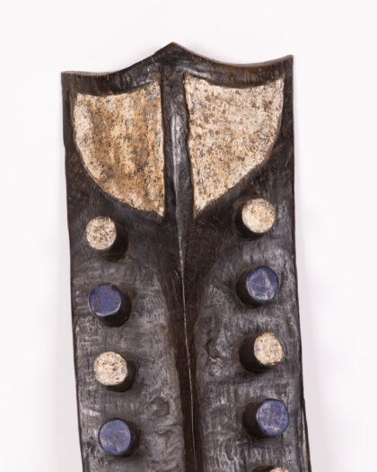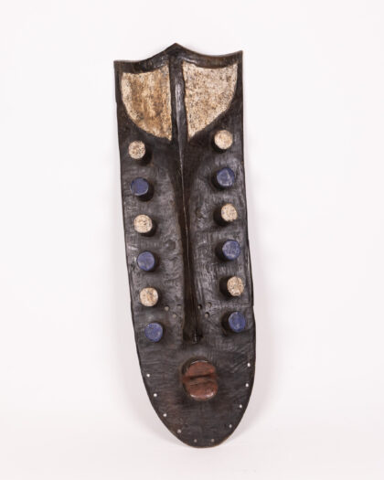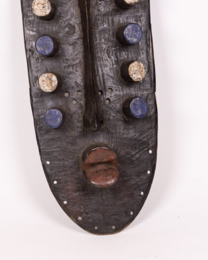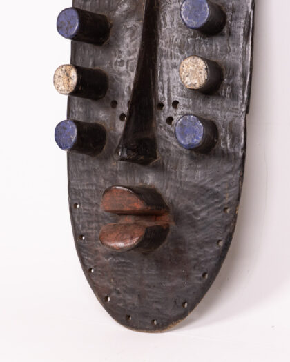 Discover this striking hand-carved Grebo tribal mask, a truly unique piece of authentic decorative wall art originating from southeastern Liberia, near the Ivory Coast. Crafted from dark wood, possibly stained to achieve its deep hue, this mask features a tall, narrow face with a distinctive split design at the top. Eight raised circular 'buttons' adorn the mask, alternating in color between white and blue. These multiple 'eyes' signify the gift of clairvoyance, representing the mask's traditional ability to access the unseen. The face is simple, with a raised ridge suggesting a nose and a mouth formed by two thick, reddish-brown wooden pieces. As a hand-carved artifact, it may show slight imperfections, adding to its rustic charm and profound authenticity. This mask is a captivating cultural statement piece, perfect for collectors of ethnographic art or as a unique focal point in any stylish home decor.