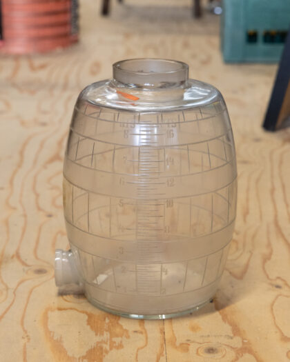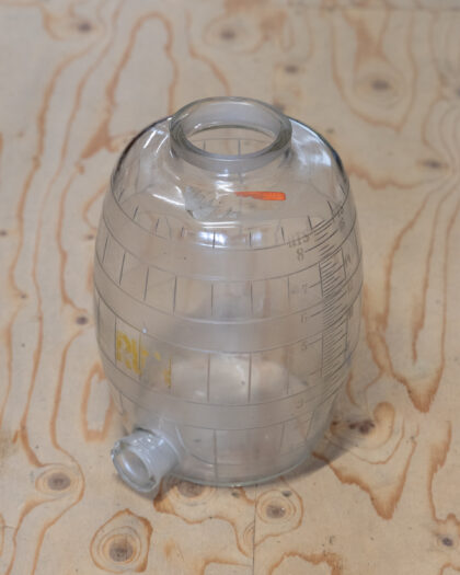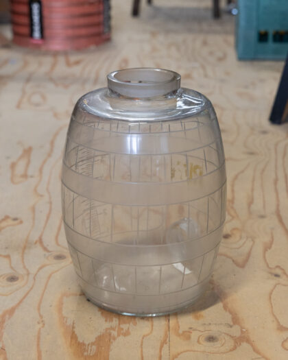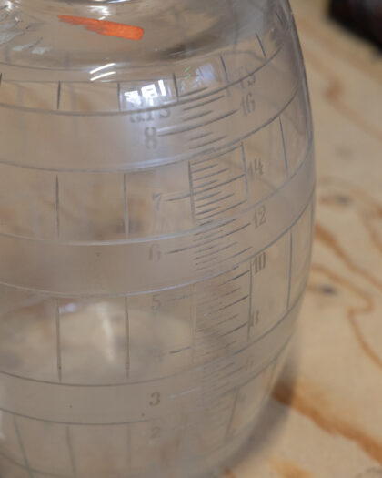 A glass decanter with yellow applied "Rum" lettering and hand etched intervals up one side.