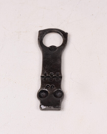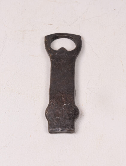 This is a hand-forged bottle opener made from iron. It has a rustic, slightly rough-hewn appearance, giving it a unique, old-world charm. The metal is finished in black. It would be an excellent addition to a home bar or kitchen.