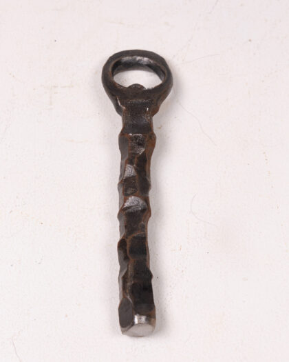 Hand forged bottle opener. Features a rustic black finish, ideal for home bars. Good condition.
