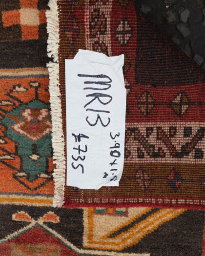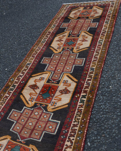 This is a hand-woven Persian Hamadan runner. The rug showcases a unique geometric pattern with black field interspersed with large geometric devices in cream, brown, red, and teal. The central field is framed by a border consisting of a running pattern. The rug measures approximately 105cm x 395cm. The rug is in good condition and features a full wool pile.