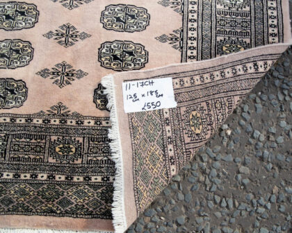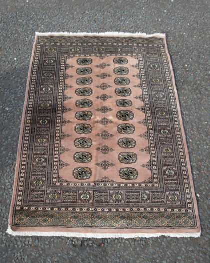 This is a hand-knotted wool rug featuring a pink field with Pakistan Bokhara Jaldar designs. The central field has repeating motifs. The border is intricate with rows of geometric shapes and stylized floral elements. The wool has a soft pile. There may be some wear consistent with age and use. This rug would make a great addition to a living room or bedroom.