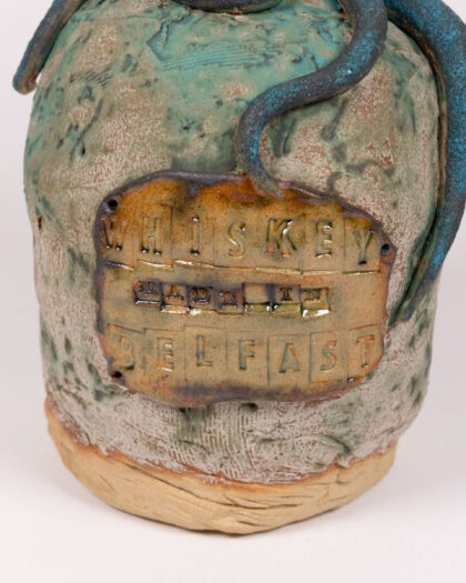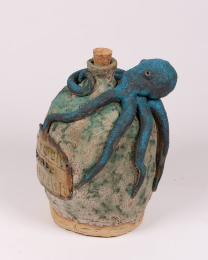 This is a quirky handcrafted ceramic jug featuring a sculpted octopus. The jug has a textured, mottled green finish with a cork stopper. A blue octopus wraps around the jug, adding a unique and whimsical touch. A rustic plaque with embossed lettering is fixed to the front of the jug.