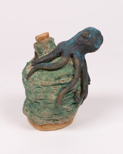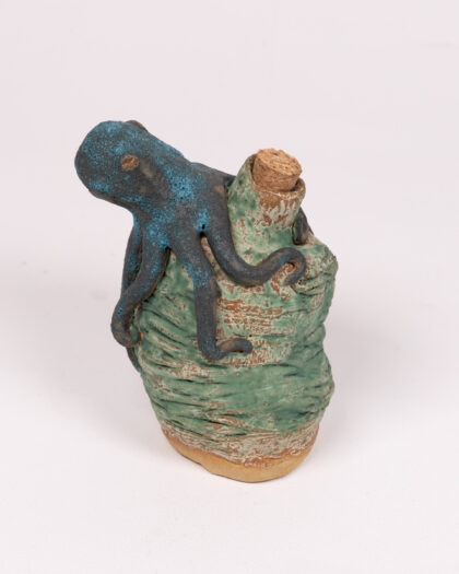 This unique ceramic bottle features a sculptural octopus design. The vase is finished in textured green and brown with a cork stopper, while the octopus is rendered in black and blue, creating a striking contrast. Handmade, this piece is perfect as a decorative accent.