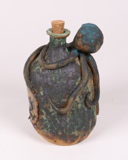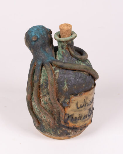 Handmade ceramic whiskey bottle featuring an octopus design and cork stopper. Reads 'Whiskey Made in Belfast'.