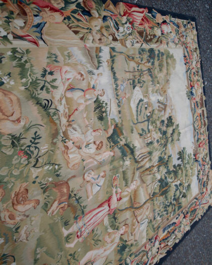 This is a large vintage tapestry rug, featuring a detailed scene depicting people in a pastoral setting. The central image shows figures relaxing and interacting amongst trees and foliage. A decorative floral border surrounds the central scene, featuring an assortment of blooms and foliage in shades of brown, cream, red and green. The rug is 100% wool. It is in good vintage condition overall, with some wear and slight fading consistent with age and use. It would work well as a statement piece in a living room or bedroom.