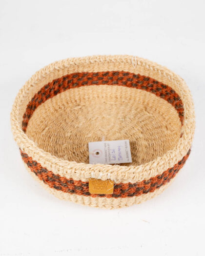 This is a woven bread basket with brown striping around the exterior. It is handmade and sturdy. The colours are natural wood and brown. It could be displayed as a decorative piece or used for storage.