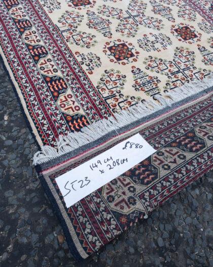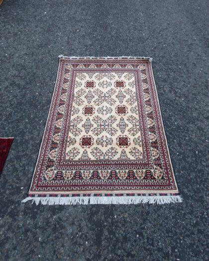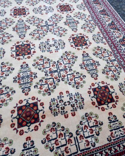 This exquisite handwoven Afghan rug features a classic Persian panel design, crafted with fine, full pick double knots. Its intricate geometric and floral patterns are beautifully highlighted in cream and red tones, adding timeless elegance to any space.
