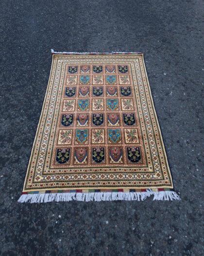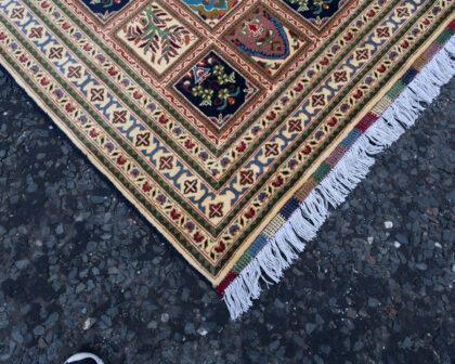 Discover the elegance of this handwoven Afghan rug, featuring a Persian panel design with a luxurious full pile. Crafted with intricate double knots, this rug showcases vibrant colours and detailed floral patterns, making it a timeless addition to any space.