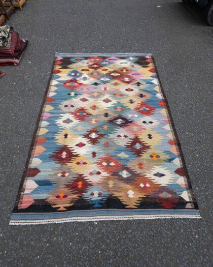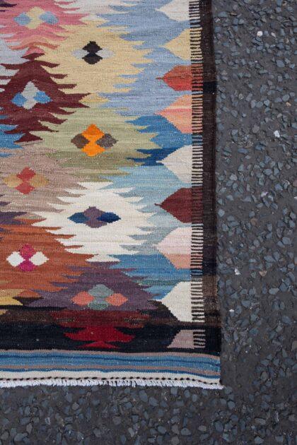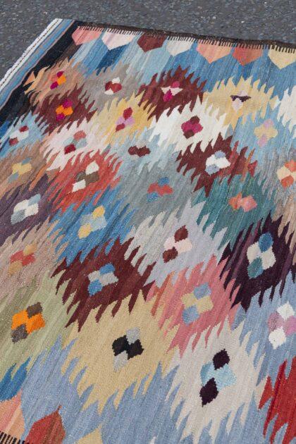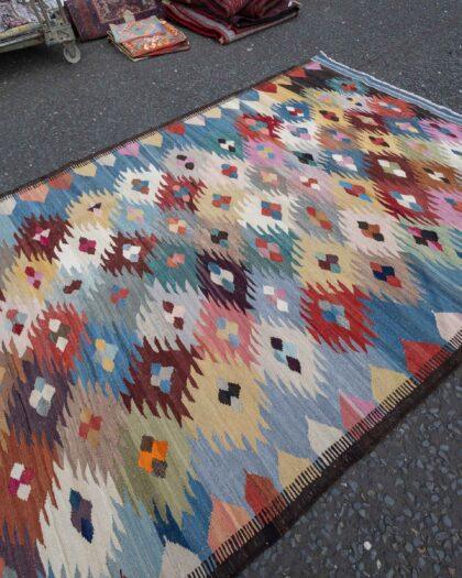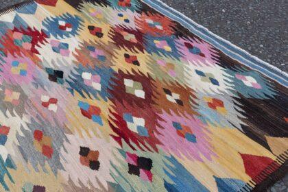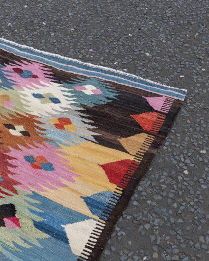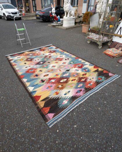 This beautiful Afghanistan Kilim rug, measuring (197cm x 296cm), showcases the vibrant colours and geometric designs characteristic of traditional Kilims. Unlike hand-knotted rugs, this piece is woven on a shuttle loom, resulting in a flat and lightweight structure that’s both durable and versatile.