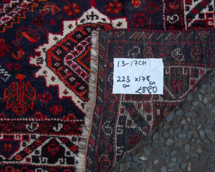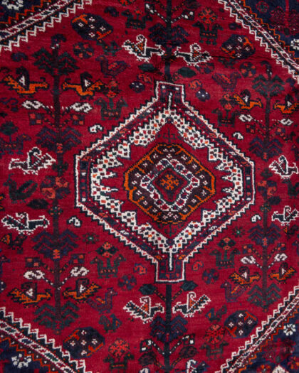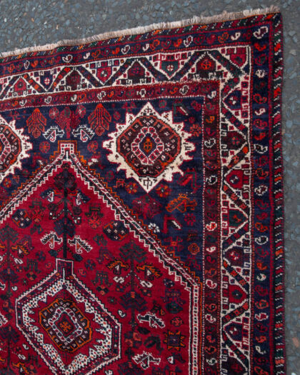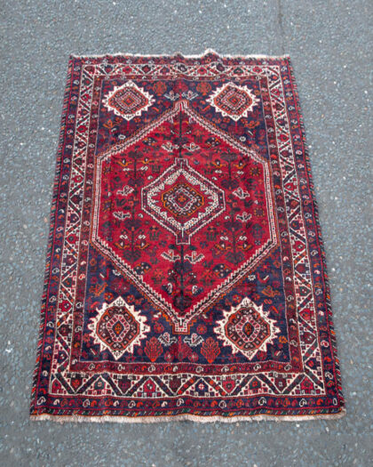 Hand woven Perisan wool rug featuring a central geometric medallion design in red, blue, and cream tones. Shows some age-related wear.