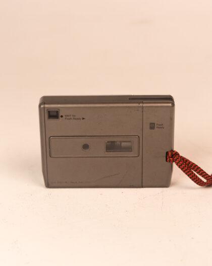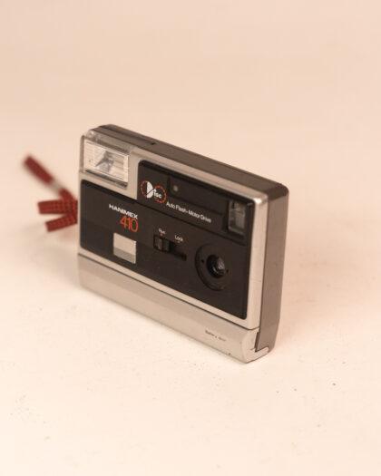 This Hanimex 410 camera features a classic design with an auto flash and motor drive. It is a collectible item perfect for vintage camera enthusiasts. The camera is in good condition with a visible battery door and operational switches, making it a functional addition to any collection. Ideal for displaying or as part of a retro photography setup.
