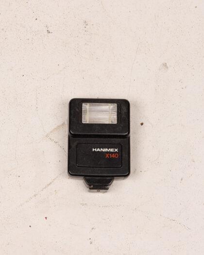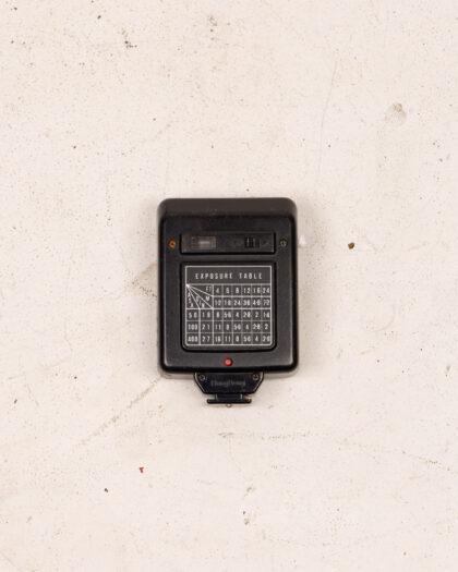 Vintage Hanimex X140 camera flash. Features an exposure table on the rear. Black plastic construction. Item is untested, sold as is. Ideal for collectors or as a display piece.