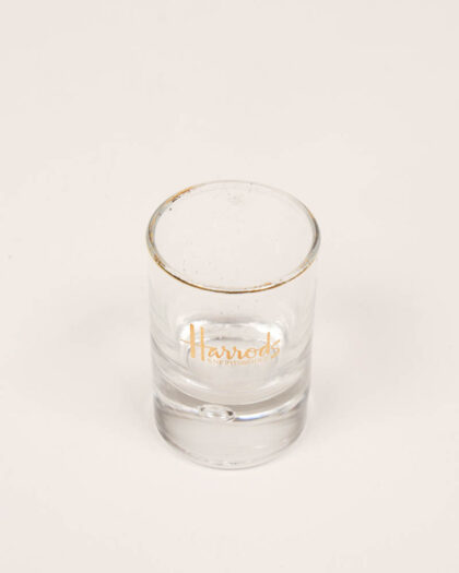 Clear glass shot glass featuring the Harrods Knightsbridge logo in gold print. Some light rim wear and staining to the glass.