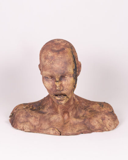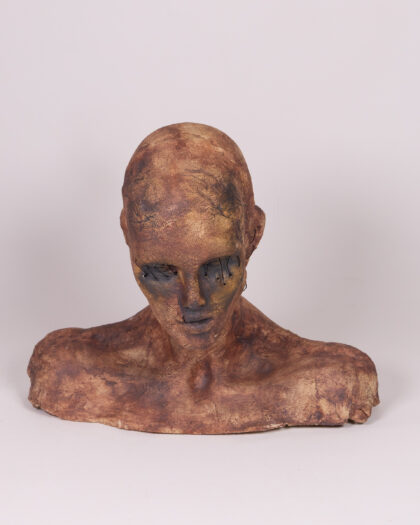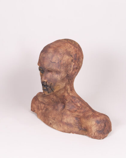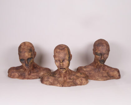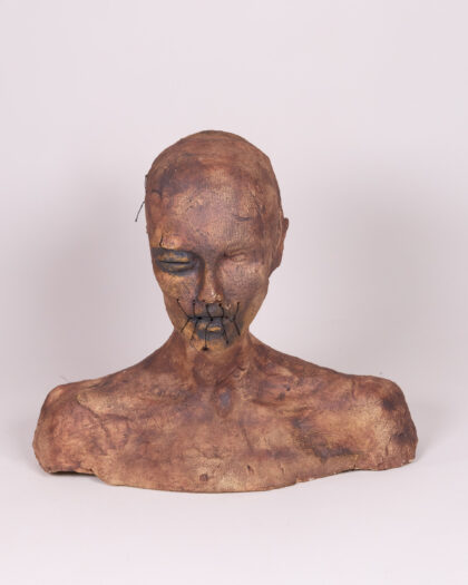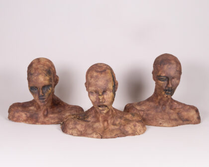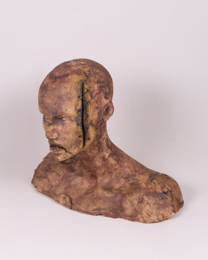 This Unique piece by an unknown artist is an attention grabbing macarbe centre piece. Featuring a set of ceramic bust sculptures, each with a unique and unsettling aesthetic. The busts are primarily brown in colour, with accents of black around the eyes and mouth. The material is textured ceramic, giving them a rough, handcrafted appearance. The standout detail of these sculptures is the hand-sewn accents, which appear as stitches around the eyes, mouth and on the head. This element adds a layer of mystery and artistic expression to each piece. They would make interesting additions to a living room, lounge or study.