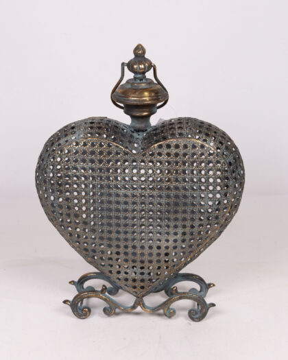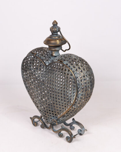 Elegant heart-shaped candle holder crafted from metal with a woven design. Features a distressed finish with hints of blue and bronze, adding a touch of vintage charm. The intricate detailing and sturdy base make it a beautiful decorative piece for any room. Perfect for creating a warm and inviting atmosphere.