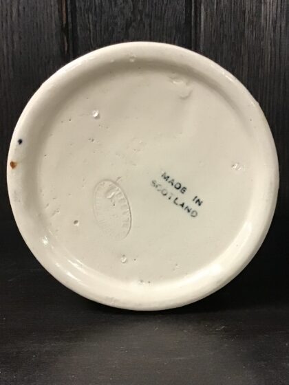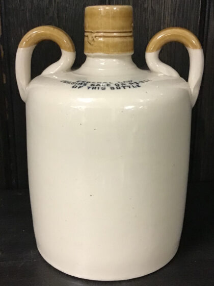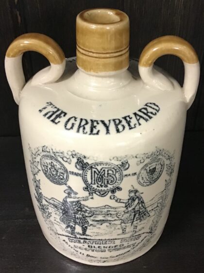 A brown two-tone glazed twin handle stoneware flagon from Mitchell Bros. Ltd., Glasgow, Scotland. "Heather Dew Blended Scotch Whisky The Greybeard". Bears black lettering. Made by Possil Pottery Glasgow and bears impressed mark and black backstamp to base.